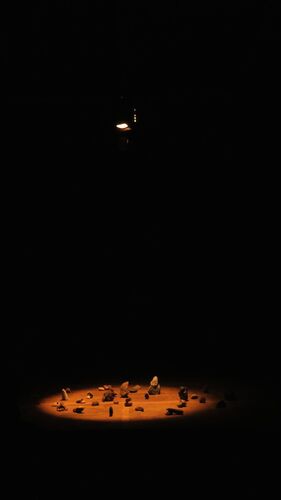 お客さんを迎えるのは、ライトアップされた無言の石たち!!! それぞれ違う土地からやって来て、その土地のエネルギーを内在しているであろう様々な石たち。それぞれが呼応しあっているのではないか!?と夢想しつつ、石を天空とも見立てつつの舞台最前線。…