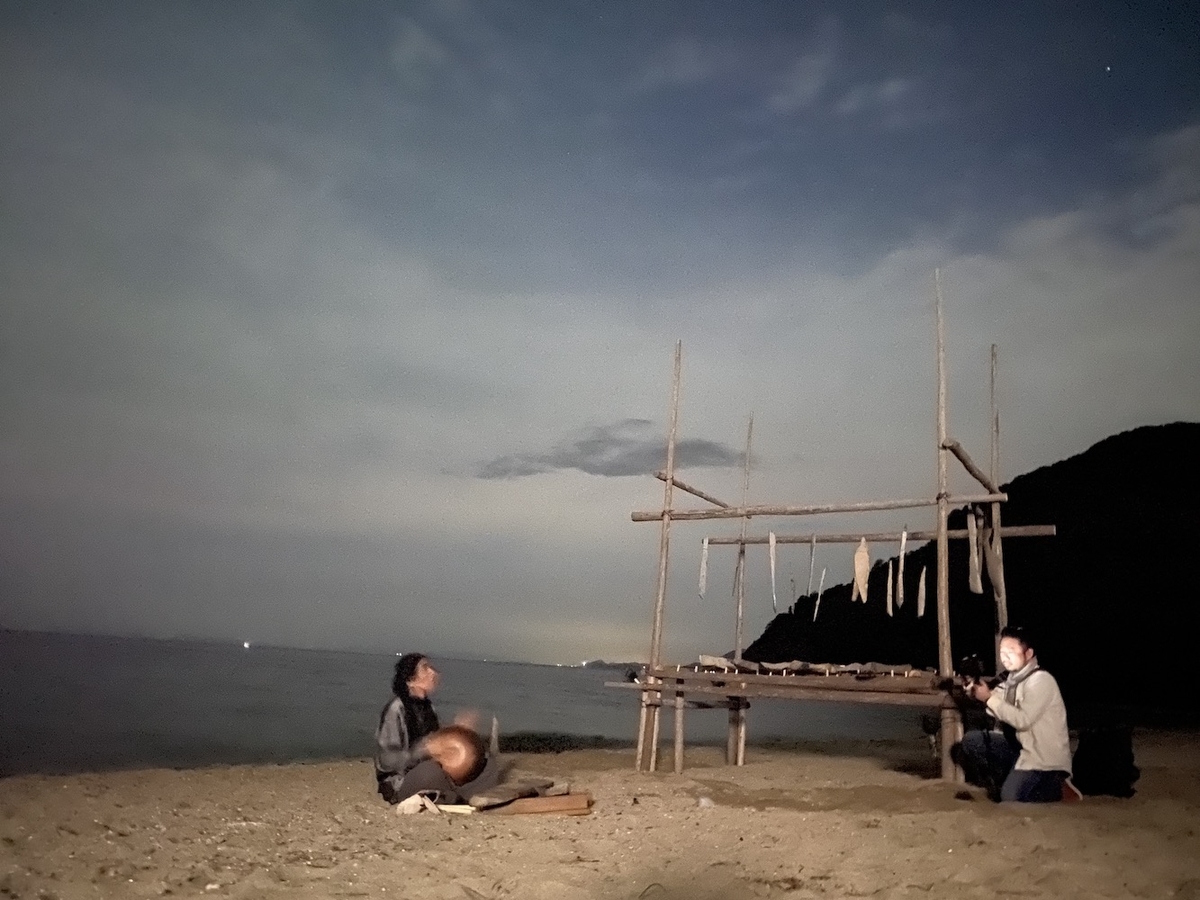 夕陽のサヌカイトの撮影が終わり、そこからは一旦関係者が現場を離れるので、小林さん、すぎさん、俺の関東からやって来た3人組でサヌカイトの櫓の見張りをする事にした。