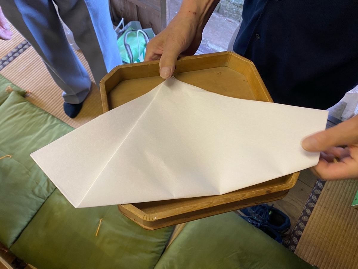 白翁は、右手に半紙を折ったものを進む方向に向けてに持っている。今までは、頂点が二つになった三角だったが、タイミングよくも、師匠の和さんが、三方にお供えを乗せる時には、こうやって頂点を合わせて折るんだよ!と始まる前に教えてくれたことで、白翁の持つ半紙もこれに違いないと閃いて、その折り方で試みてみたら、まさにドンピシャ!!!