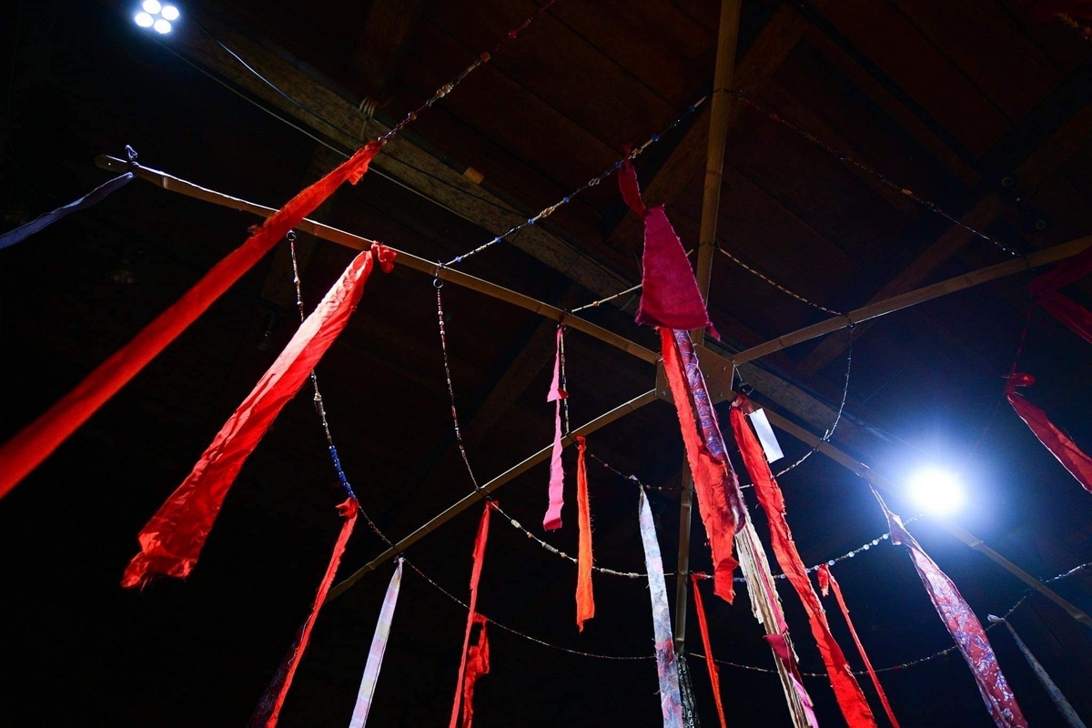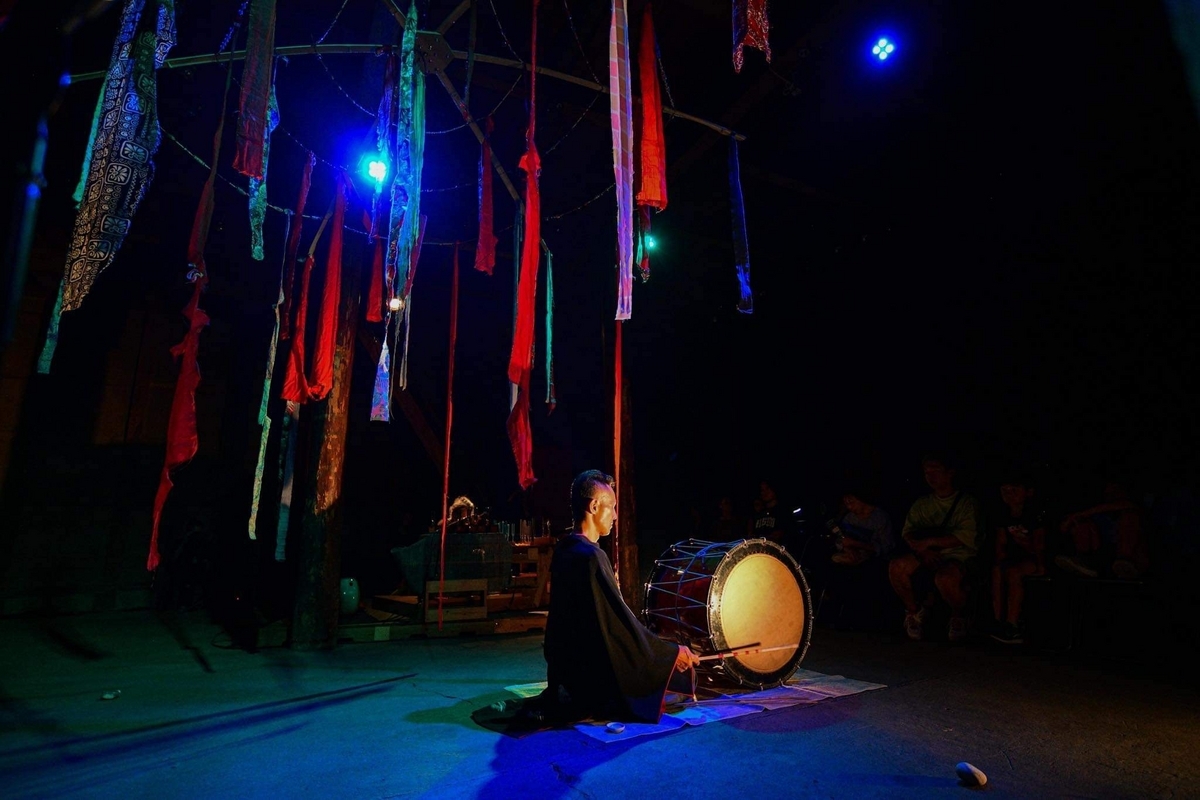 高橋さんは、舞踏公演の舞台美術にも関わることが多かったこともあり、彼の作った竹の骨組みから垂らされた布は、ある意味芸能の根源的なビジュアルを空間に映し出していた様に感じられた。